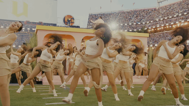 这些表演者身着定制草叶服装,在表演中灵活移动、重组空间边界,既解决了运输限制,又让“森林”具备动态生命力——开场时他们密集排列形成甘蔗田,中段分散为街区绿植,收尾时聚拢成背景,完美适配叙事节奏。这一设计将戏剧“活体道具”理念转化为超级碗级别的工程解决方案,成为行业经典案例。