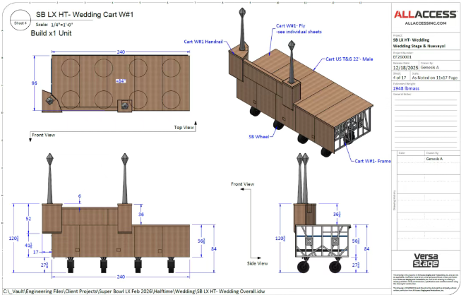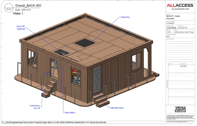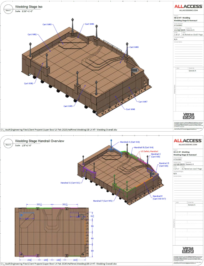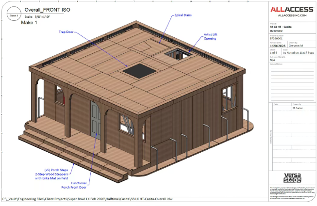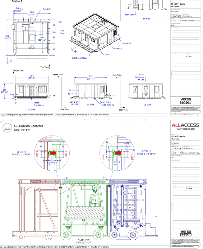此次超级碗中场秀的核心挑战,是“7分半钟完成搭建、13 分钟表演、3分钟拆除”的时间极限——所有舞台装置、设备、人员必须在特定时段内,完成从“橄榄球场”到“拉丁小镇”再到“清空场地”的全过程。本次制作由Tribe Inc.统筹,联合Yellow Studio、PRG等20+团队、超1200名工作人员,以“军事级precision”完成任务。