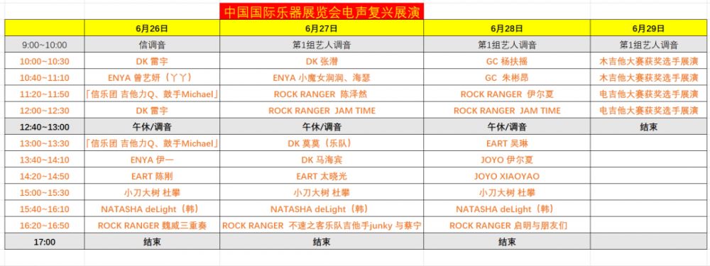 ? DK 雷宇、ENYA 曾艺妍(丫丫)、【信乐团 吉他力Q、鼓手 Michael】、ENYA 伊一、EART 陈刚、小刀大树杜攀、NATASHA deLight(韩)、ROCK RANGER 魏威三重奏、DK 张潜、ENYA 小魔女润润与海瑟、ROCK RANGER 陈泽然、ROCK RANGER JAM TIME、DK 莫莫(乐队)、DK 马海宾、EART 太晓光、ROCK RANGER 不速之客乐队吉他手 junky 与蔡宁、GC 杨扶摇、GC 朱彬昂、ROCK RANGER 伊尔夏、EART 吴琳、ROCK RANGER 启明与朋友们等,每一位都是各自领域的佼佼者,他们的现场演出绝对不容错过!
