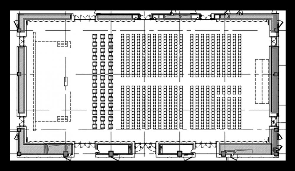 本项目位于苏州河与黄浦江交汇处,与“东方明珠”隔江相望,由3栋会议楼组合而成,其中2栋会议楼的前身是具有百年历史的老仓库。整体建筑地上空间共4层,分别由会见厅、宴会厅、主会场、峰会厅及多功能厅等组成。本项目的设计对象为位于2层的主会场,又名“星空厅”,是接待国内外重要来宾、举办大中型国际会议或商务活动的场所,面积约1 560 m2,最大高度约 11.3 m,室内容积约16 200 m3,最大坐席数为702座,每座容积约23.1 m3。平面图见图1。