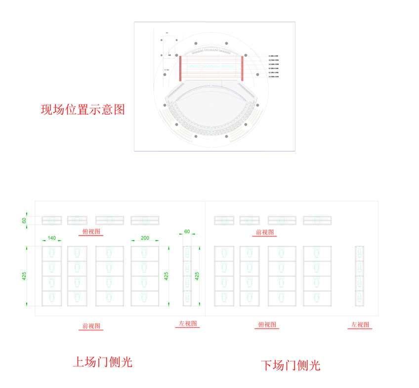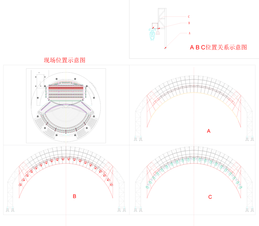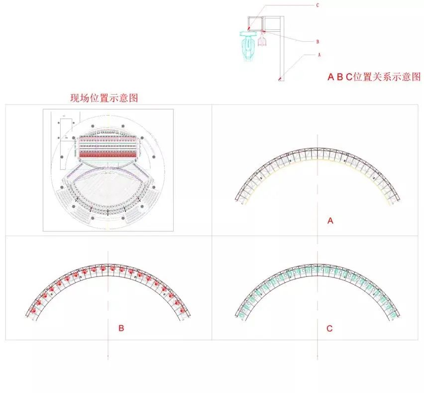 主舞台区的灯位由弧形屏后焊接的同弧度灯架及主屏前方一道数控升降梁组成。