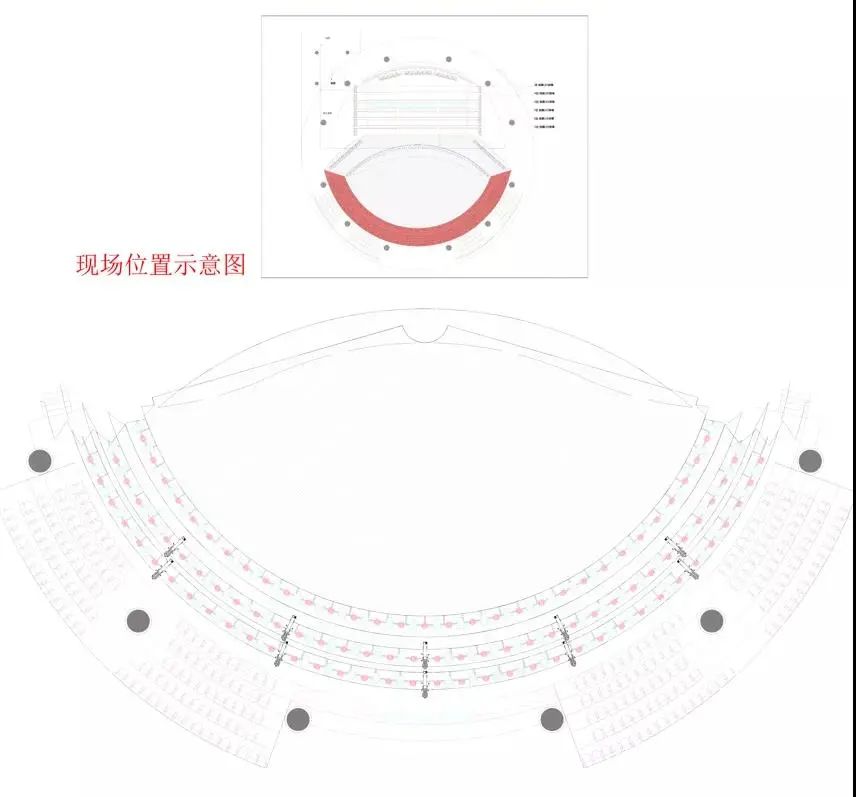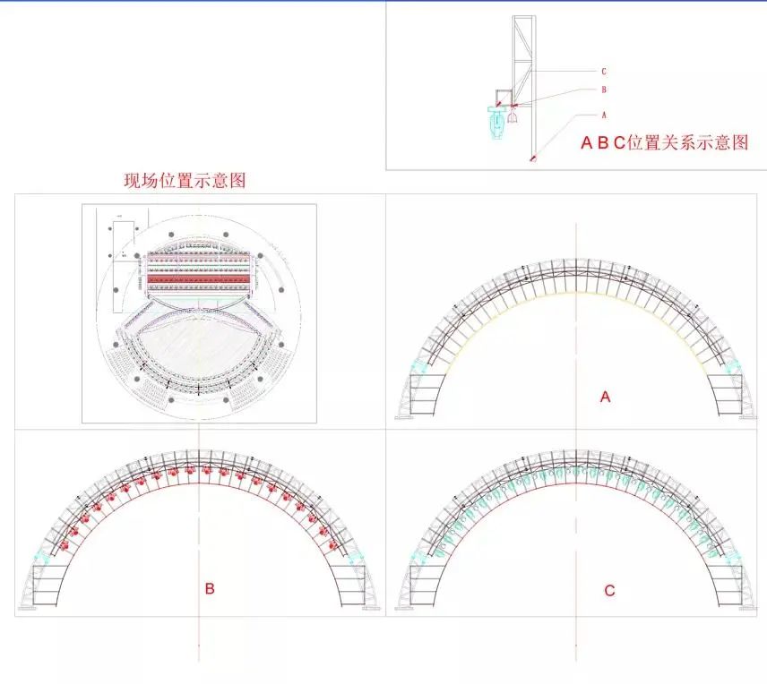 面光方面,此次根据一号厅的结构特点,舞美将观众席设计成穹顶样式,整个观众席被穹顶包围,灯光需要结合舞美的结构特点,在观众席后上方开了三道面光口,分为三层: