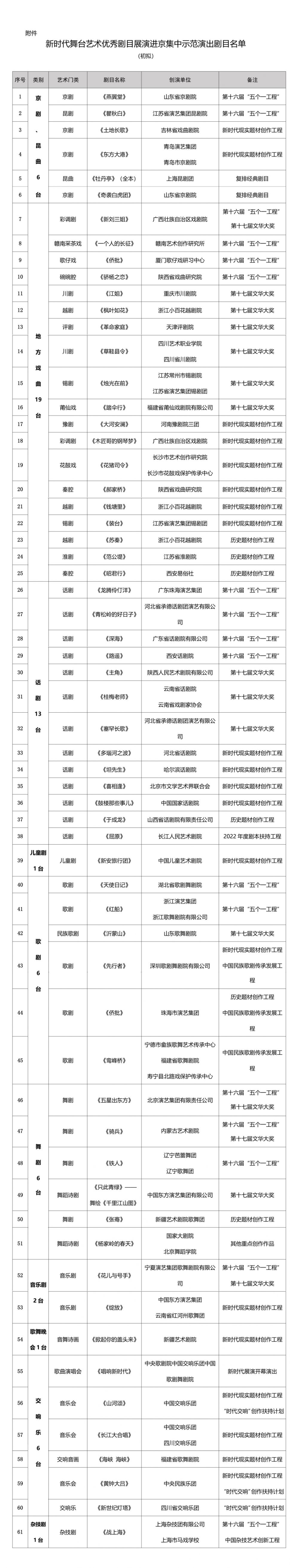 从第十六届精神文明建设“五个一工程”戏剧类优秀作品、第十七届文华大奖获奖作品和新时代现实题材创作工程、历史题材创作工程、2022年度剧本扶持工程等近年来组织实施的创作扶持工程作品名录中,拟选部分优秀新创和经典保留舞台艺术作品进京集中示范演出。