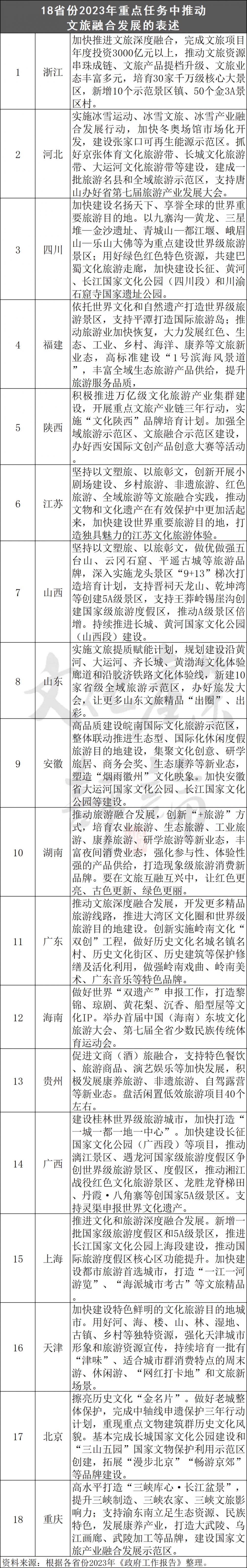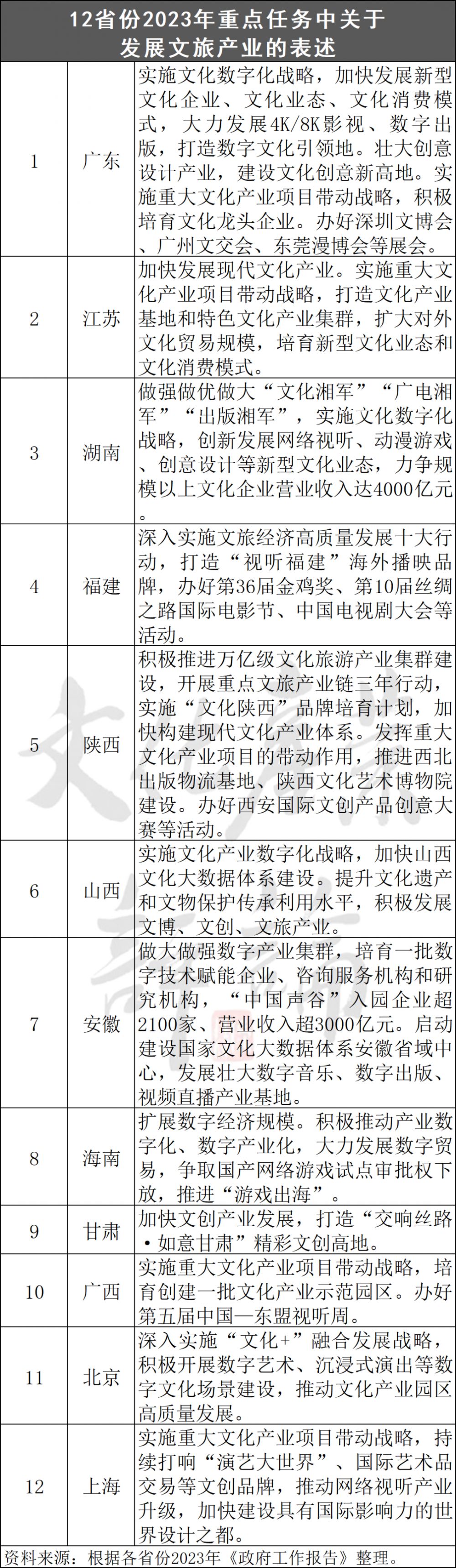 此外,福建、河北、山西、安徽、甘肃、海南、广西等7省份也对推动文旅产业作出部署。如,福建实施文旅经济高质量发展十大行动,河北大力发展后奥运经济和文旅产业,陕西积极推进万亿级文化旅游产业集群建设。