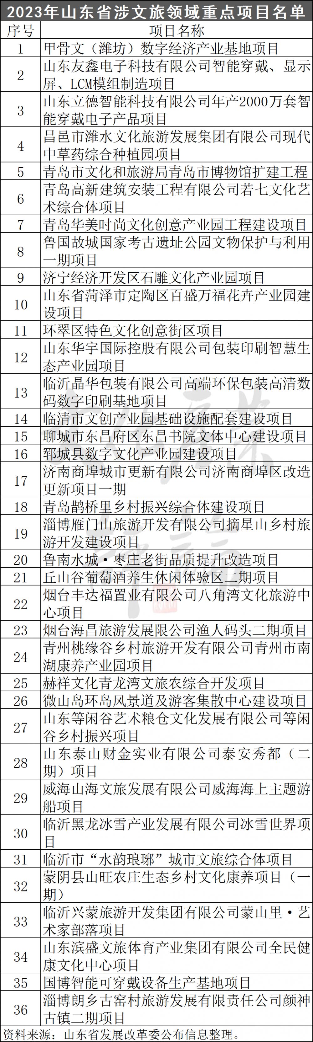 8.山东省涉文旅领域重点项目36个。据山东省人民政府发布《关于下达2023年省重大项目名单的通知》,2023年省重大项目共602个,包括525个实施类项目和77个准备类项目。据不完全统计,其中涉及文旅领域的重点项目有36个,涵盖新老动能转换、文化产业园区、智能穿戴制造、文旅综合体等。