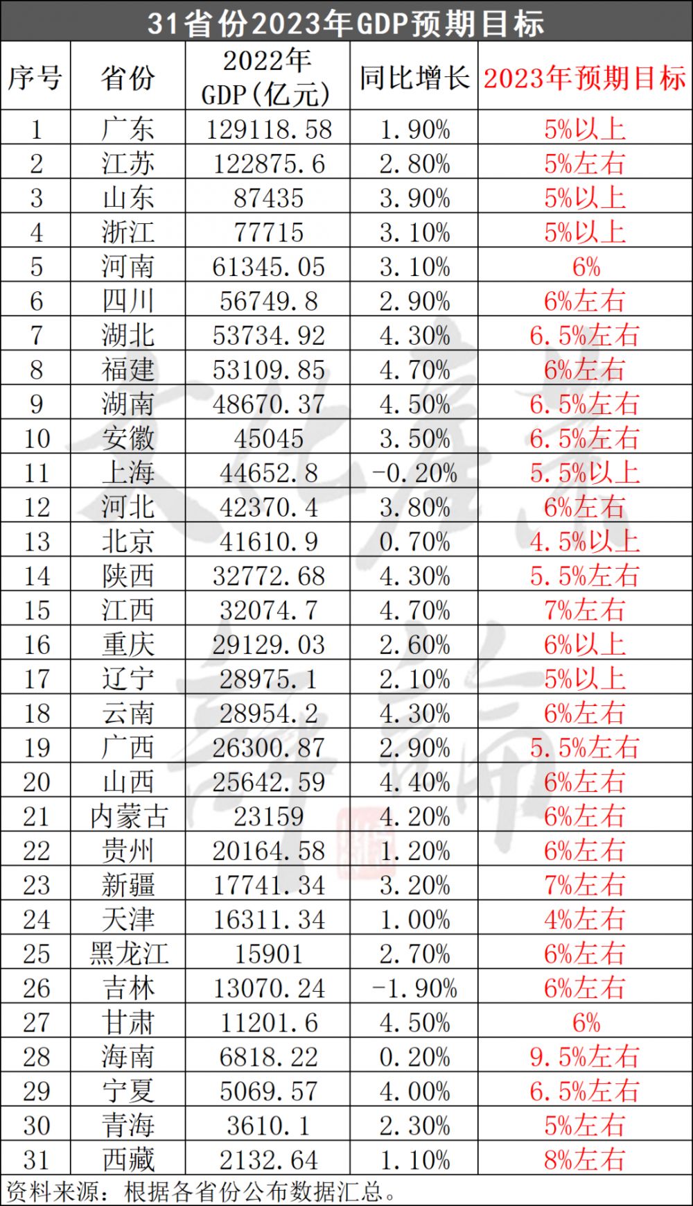 与此同时,从31省份政府工作报告披露的2022年经济数据和2023年GDP预期目标看,因受疫情频发及相关政策等因素影响,2022年各地经济总量和增速分化较为明显;2023年普遍比2022年更加审慎,预期目标普遍设定在“5%以上”胜算区内。