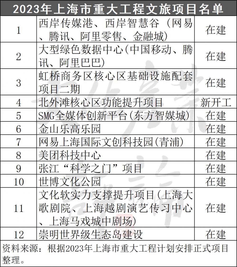 6.上海市涉文旅重大工程项目12个。据上海市发展改革委发布信息,2023年,上海市重大工程计划安排正式项目191项,其中科技产业类77项,社会民生类27项,生态文明建设类17项,城市基础设施类62项,城乡融合与乡村振兴类8项;另计划安排预备项目48项。其中,包括江复旦国际创新中心、金山乐高乐园、上海大歌剧院、世博文化公园等多项文旅工程项目。
