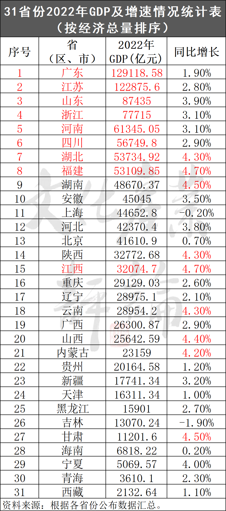 2.31省份经济增速呈“多极分化”。2022年,全国经济增速为3%。但从31省份2022年经济增速情况看,总体上呈“多极分化”。其中,增速超过4%的省份有10个,福建和江西均以4.70%的增速位居前列,其余8地分别为甘肃、湖南、山西、湖北、山西、陕西、云南与宁夏;上海、吉林两地为负增,经济体量分别萎缩0.2和1.9;北京与海南分别以0.70%与0.20%的微增速处于零增长区间。