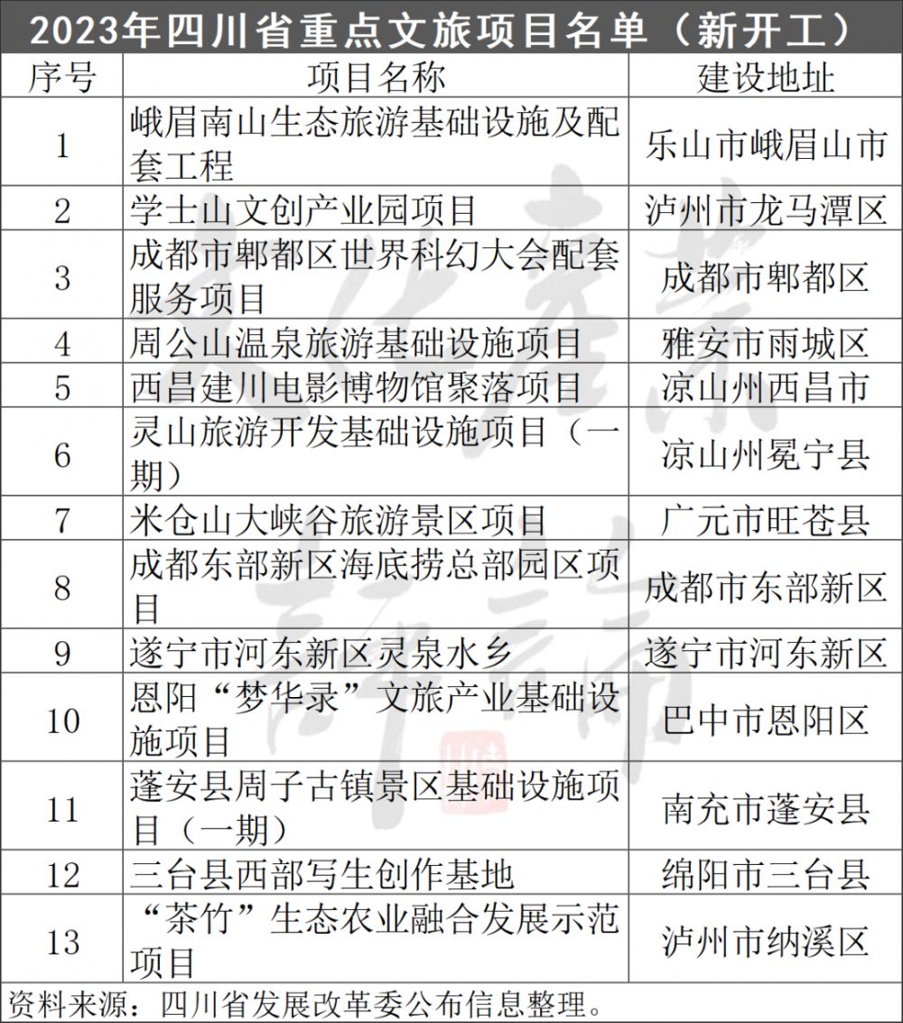 9.四川涉文旅领域新开工项目13个。据四川省发展改革委公布2023年四川省重点项目名单,共列700个项目,包括续建项目464个,新开工项目236个。据不完全统计,其中涉及文化和旅游领域的新开工重点项目有13个,包括峨眉南山生态旅游基础设施及配套工程、泸州学士山文创产业园、西昌建川电影博物馆聚落等项目。