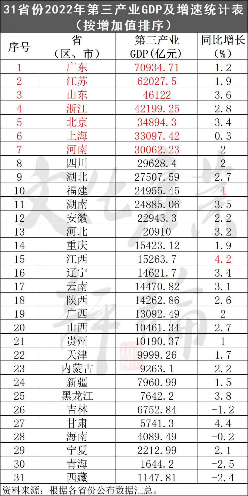 3.第三产业增加值“暗藏玄机”。2022年,全国第三产业增加值为63.87万亿元,同比增长2.3%。从31省份第三产业增加值来看(详见下表),广东成绩最为亮眼,突破7万亿元(70934.71亿元),继续领跑;其后,江苏以6.2万亿(62027.5亿元)位居第二。此外,山东(46122亿元)、浙江(42199.25亿元)均以超4万亿元分列“第三方阵”;北京、上海、河南均超过3万亿元。