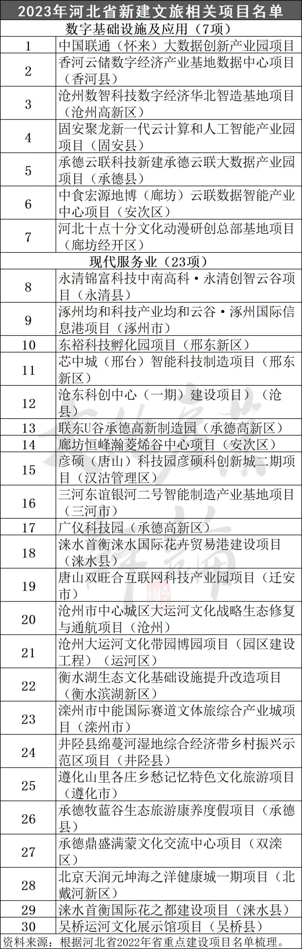 3.河北文体旅游等领域项目30个。据河北省发展改革委印发2023年省重点建设项目名单显示,2023年该省重点建设项目共安排507个,总投资1.32万亿元,年度预计投资2600.1亿元。其中,包括文体旅游等领域在内的2023年新建项目约30个(含关联项目),包括数字基础设施及应用和现代服务业两大类。