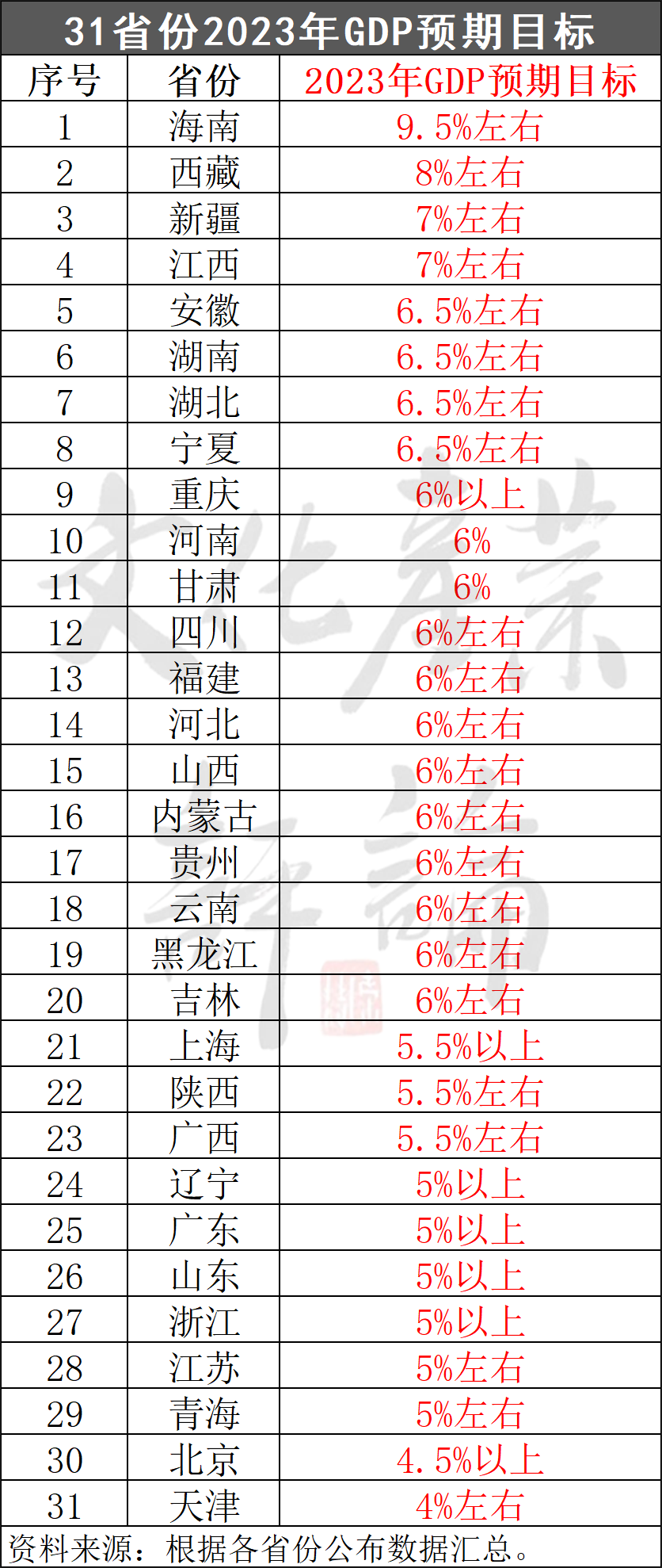 1.海南西藏跳起摸高。从各地2023年GDP预期目标来看(详见下表),广东、江苏、山东、浙江等29个省份设定在高于5%。其中,海南以9.5%预期增速,位居第一;其次为西藏,预期目标8%左右;江西、新疆均为7%左右,并列前三;安徽、宁夏、湖南、湖北为6.5%左右;重庆、甘肃、河南、吉林、黑龙江、山西、内蒙古、云南、福建、河北、四川、贵州等12个省份同时锚定6%左右区间。