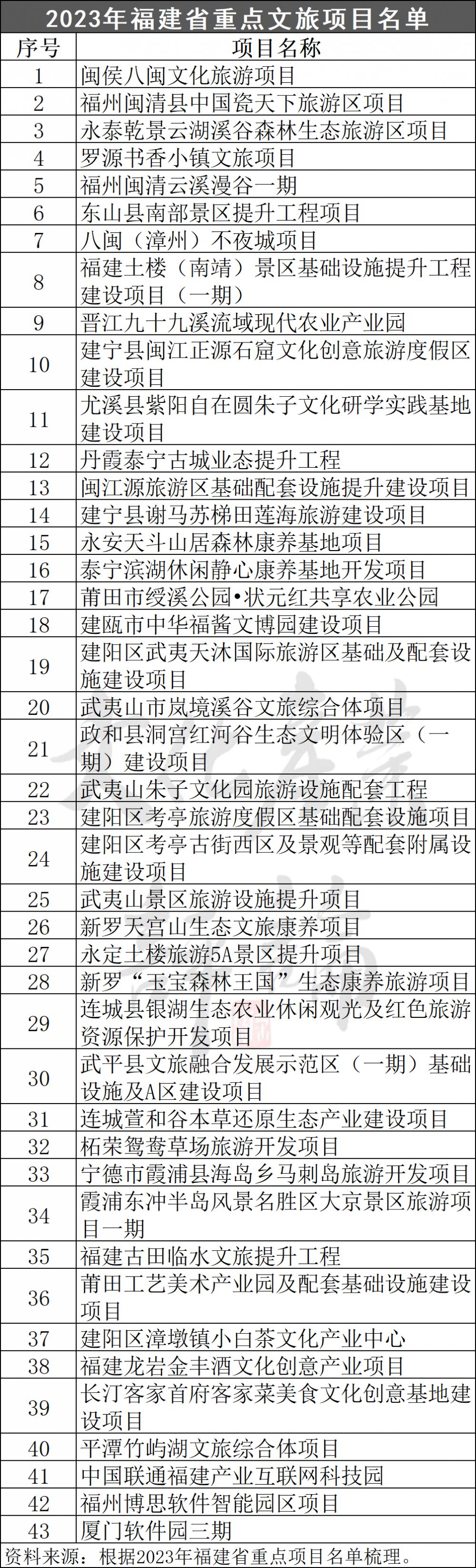 4.福建省重点文旅项目40个左右。据福建省2023年度省重点项目名单显示,2023年福建省级重点项目共1580个,总投资4.09万亿元,年度计划投资6480亿元。其中,纳入现代服务业的重点文旅项目有43个,包括福州闽清云溪漫谷一期、八闽(漳州)不夜城、武夷山市岚境溪谷文旅综合体等。