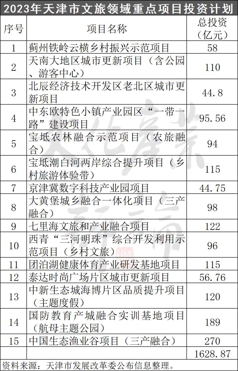 7.天津15个文旅项目单个投资超40亿。据天津市发展改革委公布信息,2023年,天津共安排重点建设项目673个,总投资1.53万亿元,年度计划投资2360.57亿元。包括新开工项目192个,总投资3154.54亿元,年度投资934.12亿元。其中,年度涉及重大文旅及相关项目约15个,总投资超1600亿,单个项目总投资均超过40亿元。
