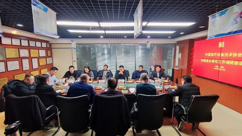 2月19日,协会理事长朱新村、秘书长黄增光、副秘书长兼专委会秘书处秘书长郭金锁一行来到河南省办事处,就开展演艺制作服务综合技术能力等级评定试点工作座谈。办事处主任尚红宾,主任专家刘政,副主任专家郭振涛,副主任陈礼周,秘书长王伟东,常务副秘书长罗可力、孙宏伟,副秘书长耿新科,会员单位代表罗陈昊、任才等参加了会议。