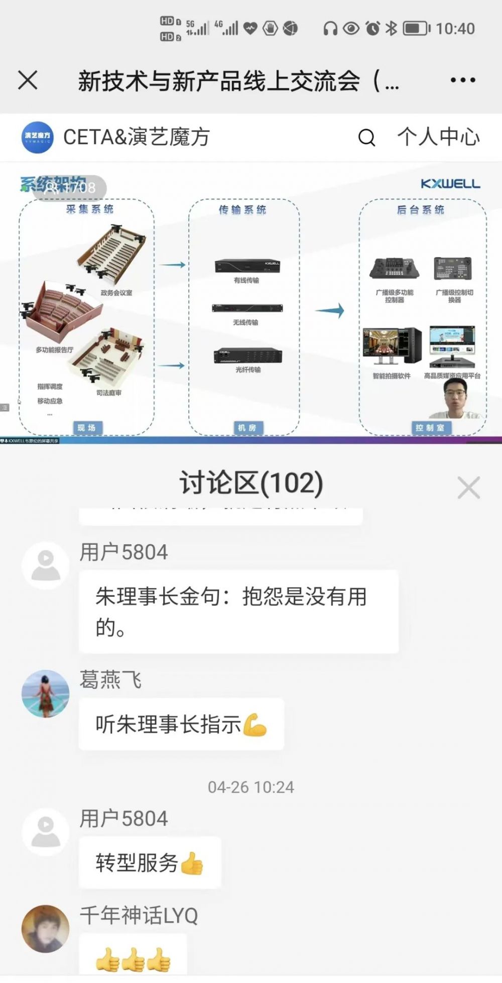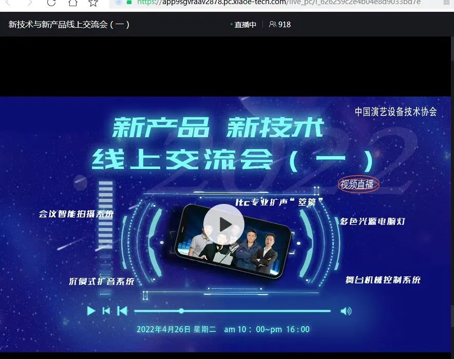中国演艺设备设备技术协会第一场新技术与新产品线上交流会于4月26日成功举办。协会官网 PC端、手机端、协会公众号、演艺科技传媒公众号同步直播,在线人数达4000+人次,受到行业广泛关注。
