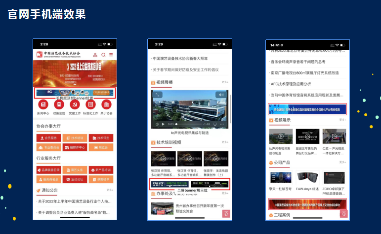 二级页面推广: 新闻中心、会员服务、技术培训、技术评定、服务商目录、演艺头条等十余个频道头部位置设置二级通栏广告版位服务;