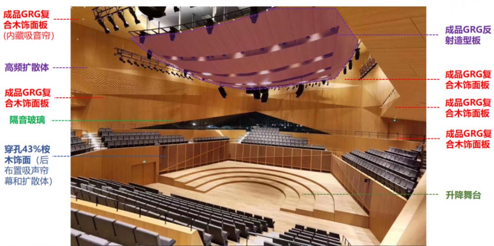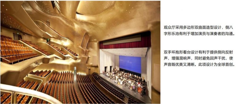 他分享了若干案例,如天津茱莉亚音乐学院音乐厅增加5~10%的成本,实现了一个剧场变成3个甚至4个剧场用的多功能性;福州海峡文化艺术中心剧场用的茉莉花瓣为意向,是陶瓷做剧场装修很成功案例;成都城市音乐做了冰芙蓉反声罩的创新,打造声学效果一流的音乐厅。