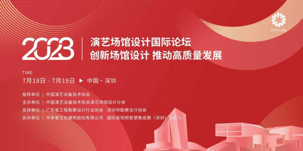 本次论坛活动的指导单位:中国演艺设备技术协会;主办单位:中国演艺设备技术协会演艺场馆设计分会;支持单位:广东省工程勘察设计行业协会、深圳市勘察设计协会;协办单位:中孚泰文化建筑股份有限公司、国际音视频智慧集成展 (深圳) 组委会。