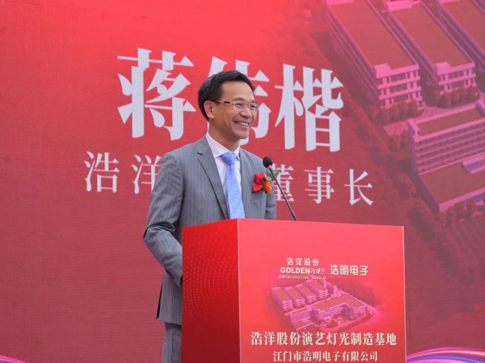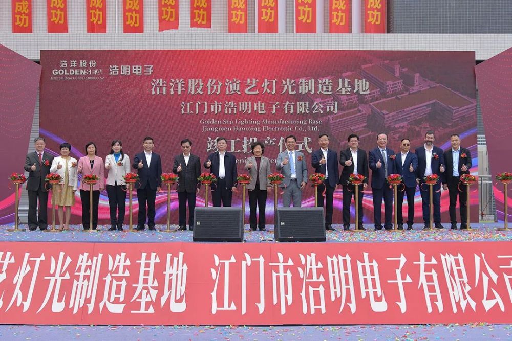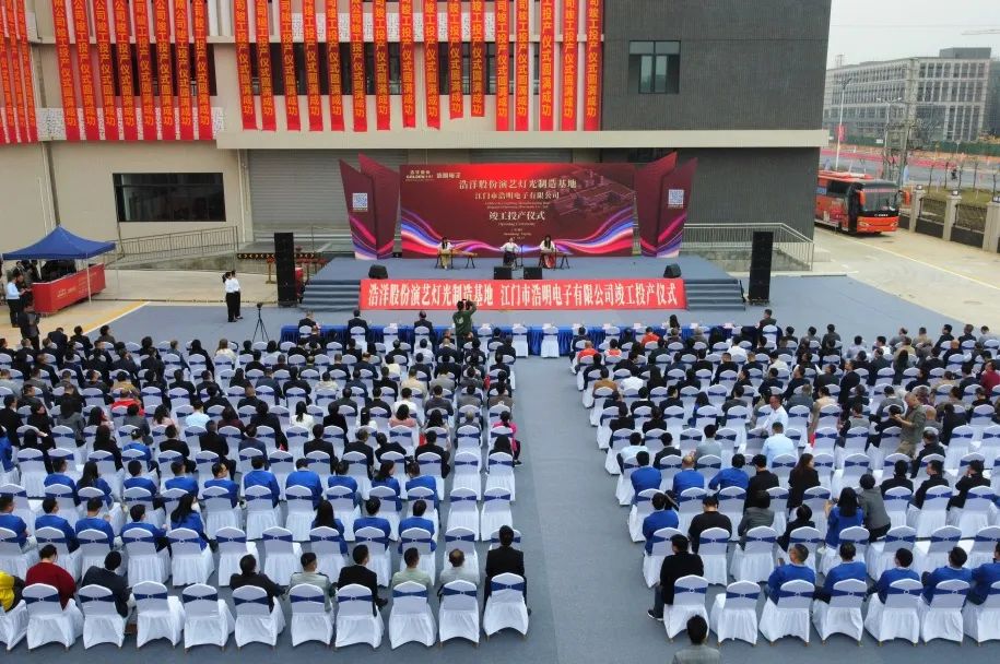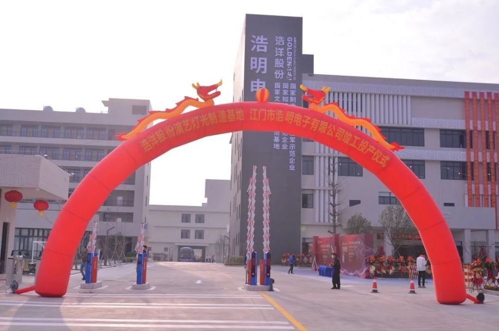1月12日,浩洋股份演艺灯光制造基地项目江门市浩明电子有限公司竣工投产仪式在江门市产业转移工业园恩平园区举行。中国演艺设备技术协会理事长朱新村出席竣工投产仪式。该项目计划总投资6亿元,预计年产值10亿元,将有力推动恩平演艺装备产业发展。